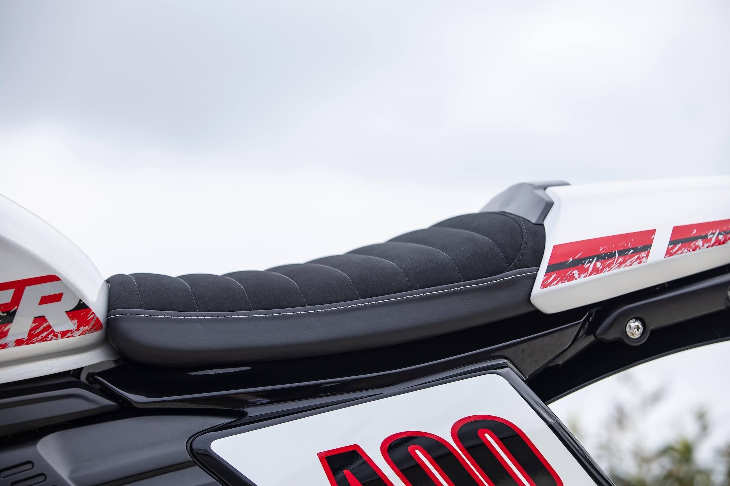 Côté esthétique et position de conduite, c’est là que le plus gros du travail a été fait. La Tracker reprend les codes du Flat Track avec son grand guidon plat, une selle rehaussée et la plaque numéro indispensable à la discipline.