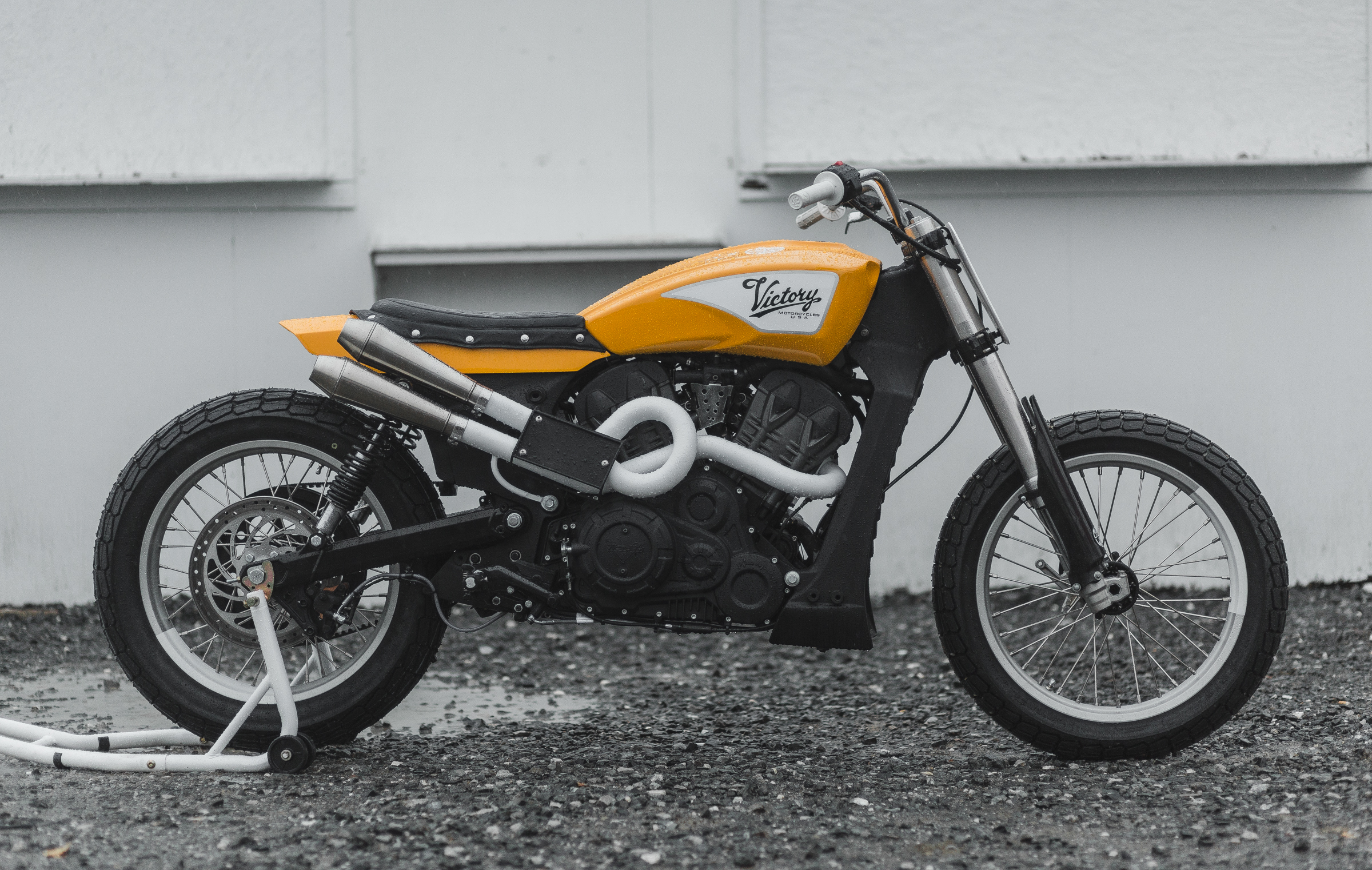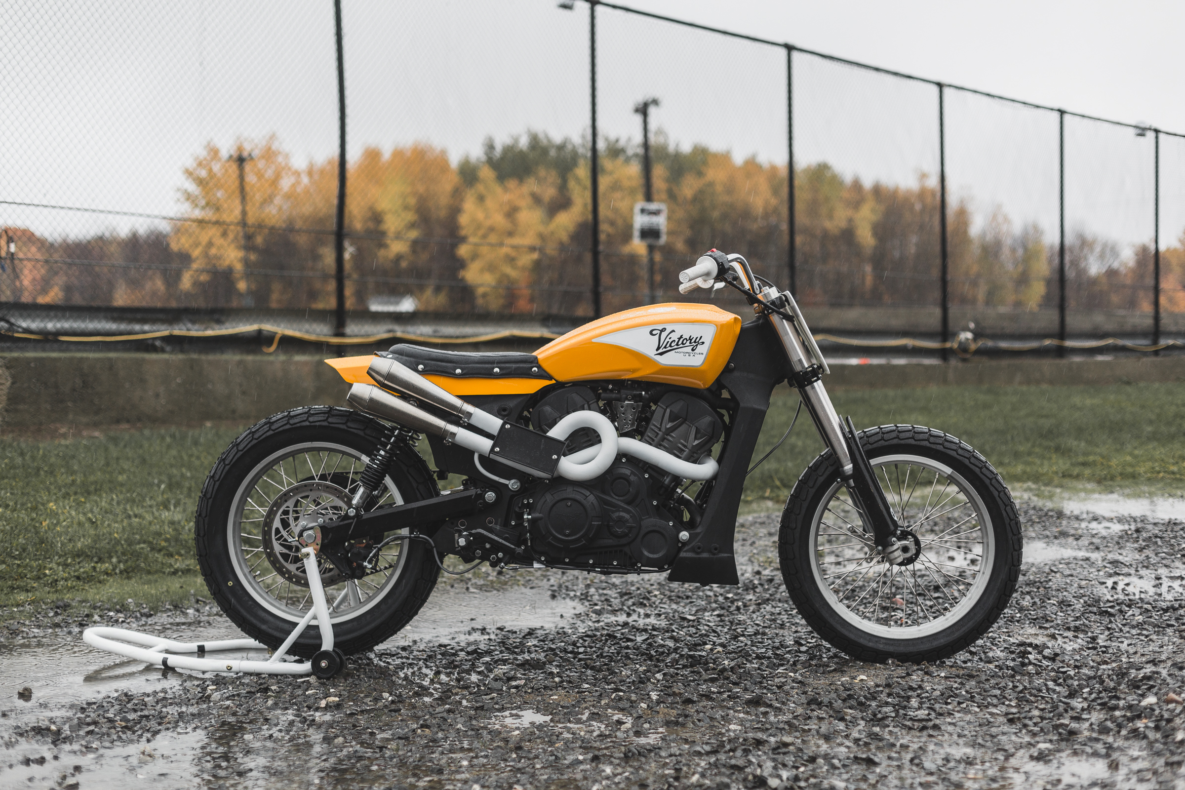 SG: Je n’avais jamais vraiment arrêté mon regard sur une Victory. En fait, honnêtement, je ne les trouvais pas très intéressantes. Mais l’intérêt pour le défi a vite repris le dessus et j’ai eu un flash. Tant qu’à faire un bike de show qui va finir sa vie dans le showroom du dealer, pourquoi pas joindre l’utile à l’agréable et en faire une moto de track ? De flat track plus précisément. Je me suis tout de suite imaginé cette grosse bête rouler de travers sur la terre battue au Fooligan Derby et j’ai compris que ce serait exactement ça le projet. Un bike de flat track.