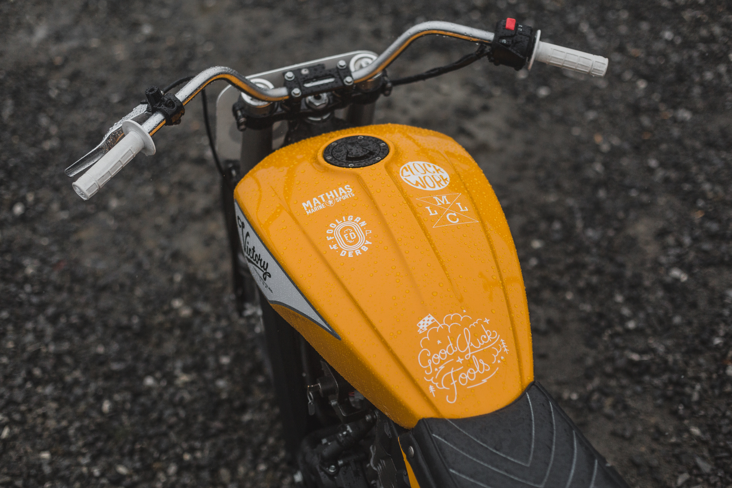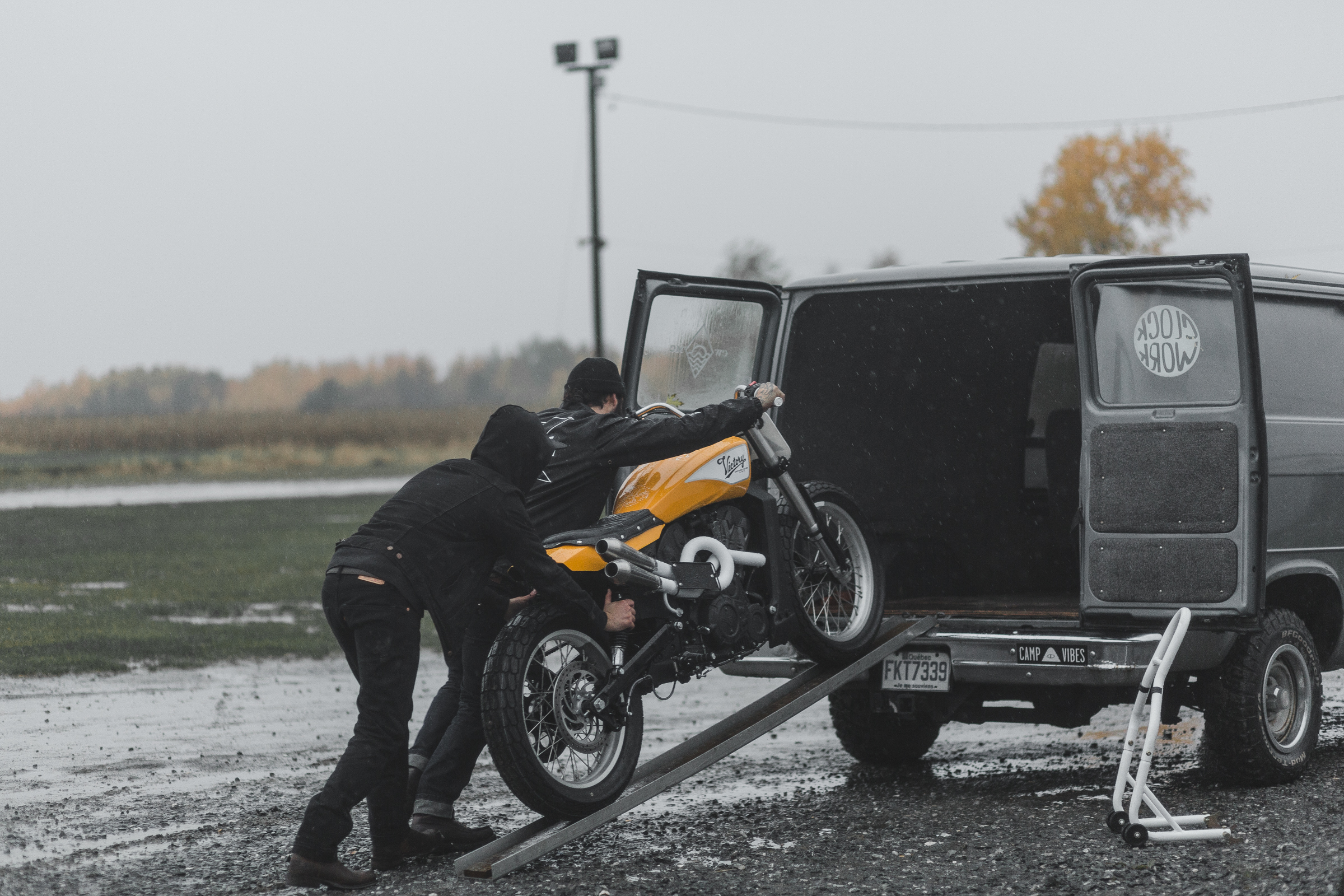 SG: En trois semaines! Clairement, c’était tight. Une fois la moto terminée, il nous restait que quelques heures avant le deadline pour envoyer les photos. J’ai fait appel à notre vedette locale, Charles-Etienne Pascal pour aller prendre quelques clichés sur la piste de Saint-Marcel-de-Richelieu où a lieu le Fooligan Derby que j’organise avec Boutique Archive et quelques copains.