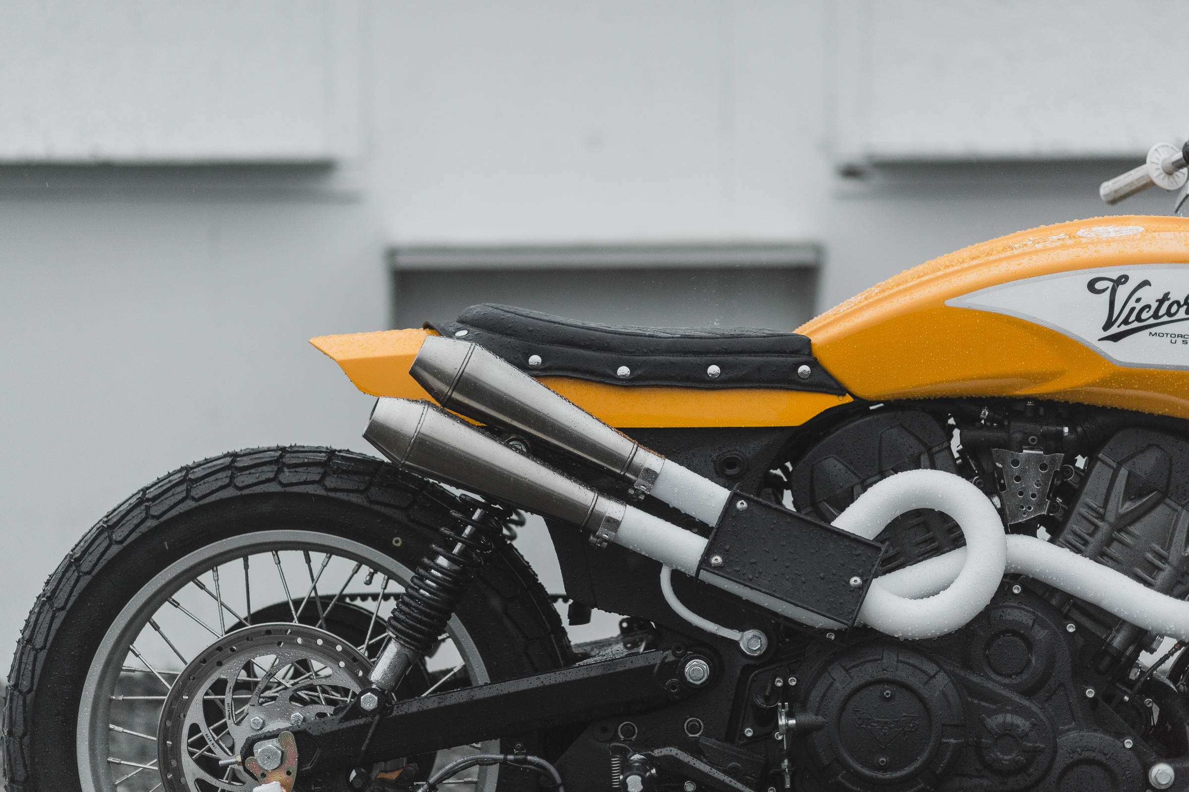 SG: Je voulais créer quelque chose d’attirant esthétiquement, mais aussi agile sur la piste. La Victory Octane est passée au grinder et a perdu une cinquantaine de livres. Ensuite sur la liste: conversion aux roues de broches 19″ avec les pneus de flat track, fourche inversée à l’avant, suspension sur mesure à l’arrière, guidon de flat track. Puis, j’ai fabriqué la section arrière de la moto et la ligne d’échappement. Le travail terminé, il ne restait que quelques jours pour la peinture et recouvrir le banc.